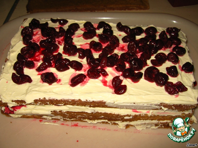 Промазать каждый корж кремом, вишню разделить примерно на 3 части, выложить между коржей на крем. Сверху на сформированный торт вишню не укладываем!