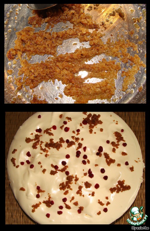 Застывший торт украшаем ягодками из варенья и хрустящей сухарной крошкой: