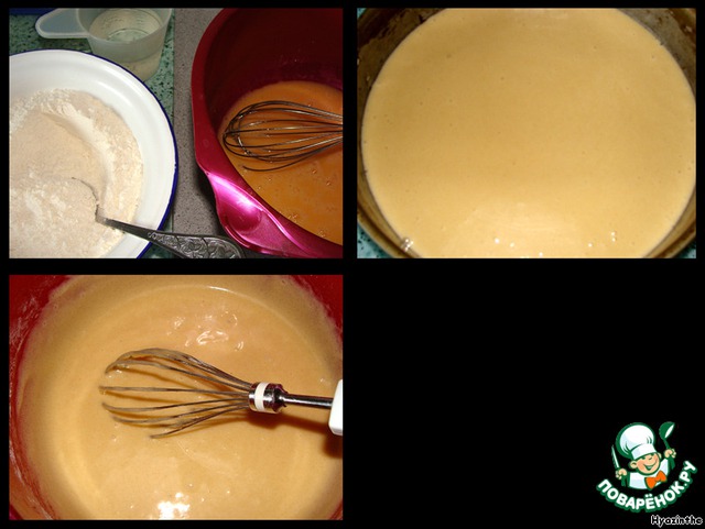 Теперь в 2-3 приема добавляем к яичной массе муку с сахаром и минеральную воду. Все хорошо перемешать и вылить в форму, дно которой застелено бумагой для выпечки (диаметр формы 24-26 см).
