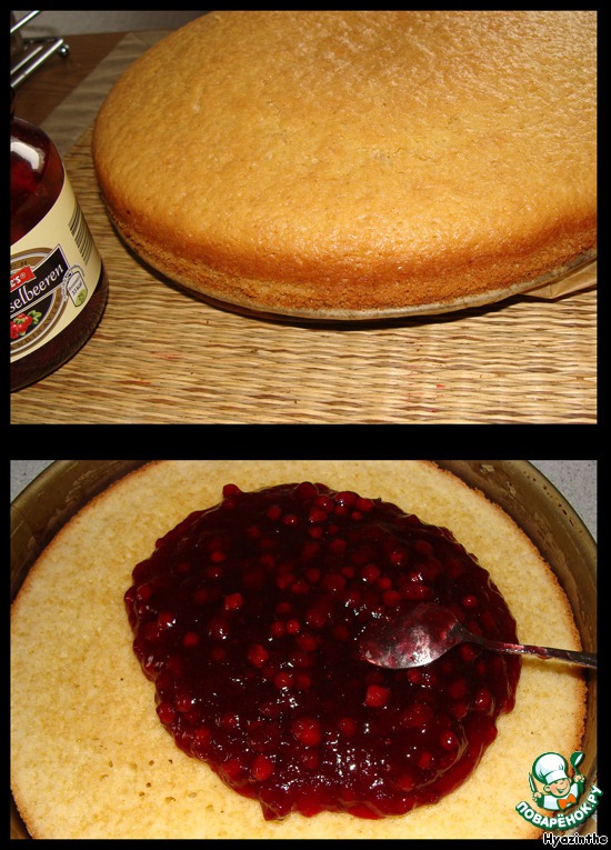 Из варенья вылавливаем несколько ягод для украшения, остальное варенье выкладываем на корж, разравниваем и отправляем все в холодильник.