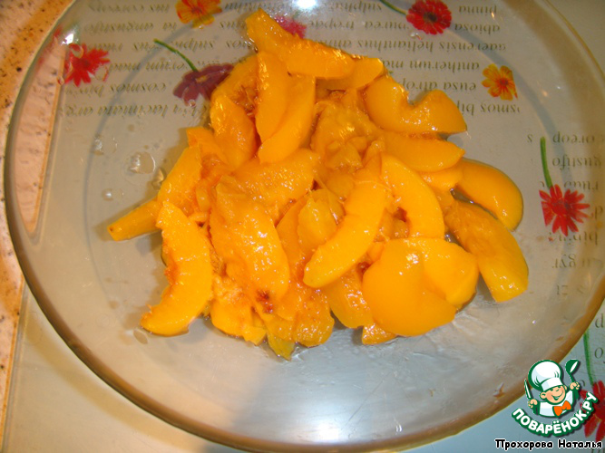 Пока выпекается наш корж, подготовим персики (у меня были собственного приготовления).