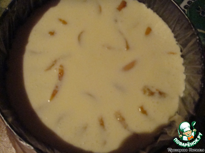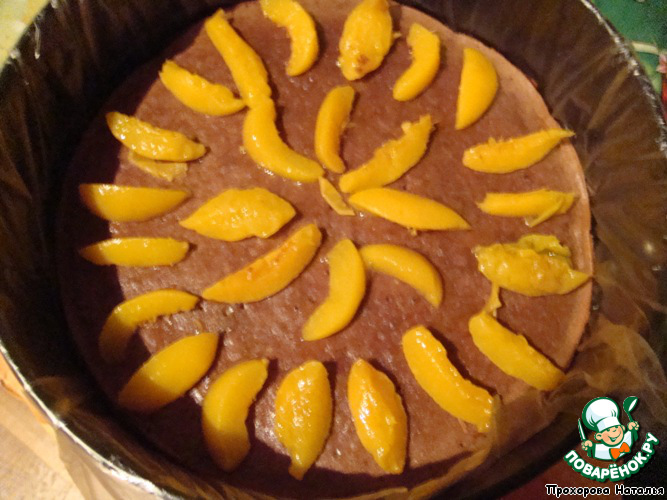 Заливаем получившуюся массу поверх коржа с персиками. И ставим в холодильник на 30 мин.