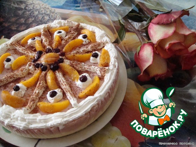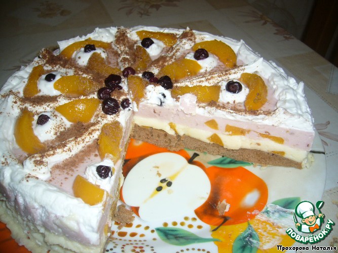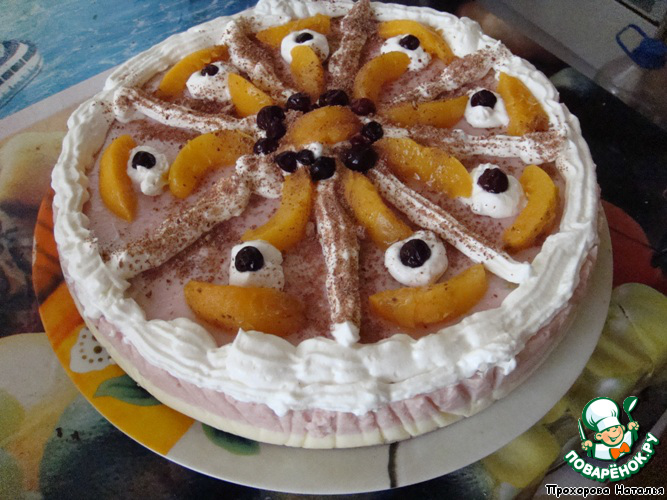 | Торт-суфле со вкусом мороженого и клубничного йогурта, с кусочками персика. Очень вкусный и нежный! |