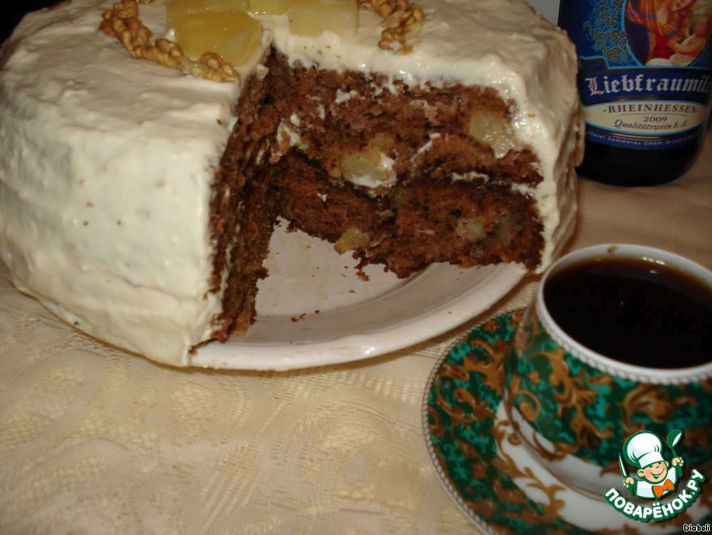 Подмешаем ананасы и орехи. Ананасы я, конечно же, разрезала на части поменьше, но оставила довольно-таки приличные кусочки. Т.к. мне хотелось, чтобы их было видно в торте.