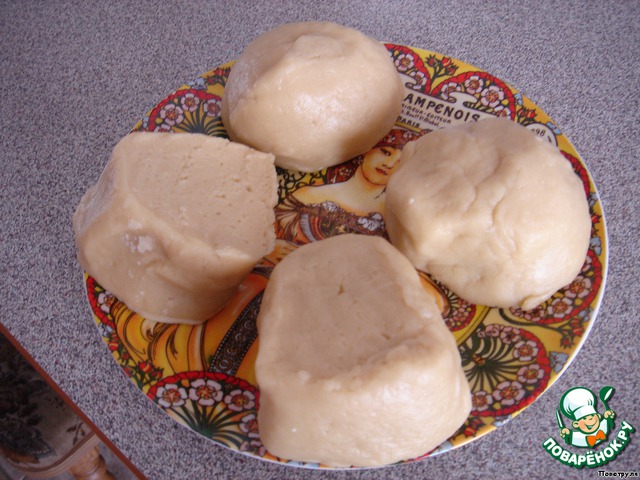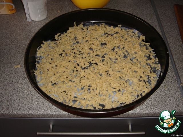 Самую большую форму обмажем маргарином и на терке трем одну часть теста. Выпекаем 10 мин (подглядываем, чтоб немножко подрумянилось) при 200 град. У меня такие формы 2, так что я быстренько: одну вытянула, сразу вторую поставила и т. д.