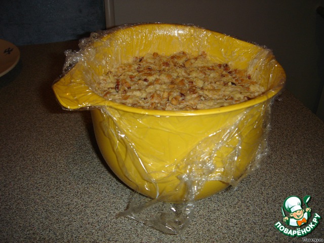 Мне надо было форму корзины, я выбрала высокую миску, застелила пищевой пленкой и хорошо пресовала всю смесь (форма не очень удачная, крошился, до этого я всегда утрамбовывала в низкую форму высотой 3 см.). Ставим в холодильник на пол часа.