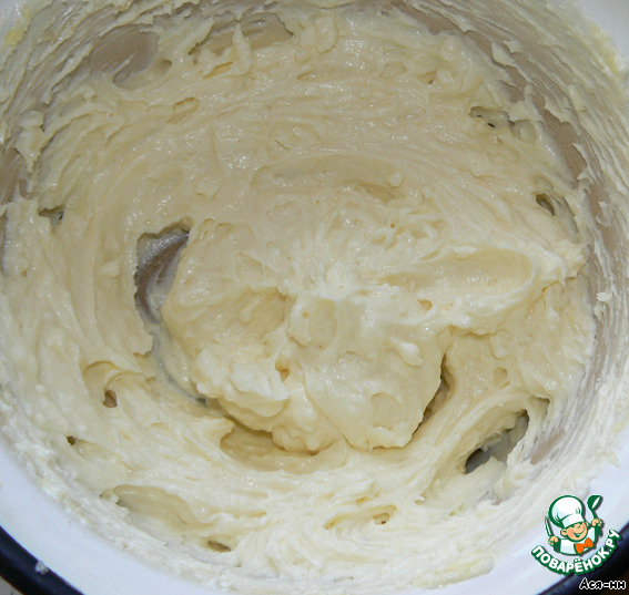 Для сметанного крема. Сметану откинуть на ткань и подвесить на ночь для того, чтобы лишняя жидкость стекла (в это время наш торт будет застывать в холодильнике). Затем в стекшую сметану добавить 1-2 ст.л. сахара и столовую ложку лимонного крема, все тщательно перемешать до получения однородной массы (в исходном рецепта вместо сметанного крема сливки 125мл взбить с сахаром и смешать с сыром маскарпоне 200г)