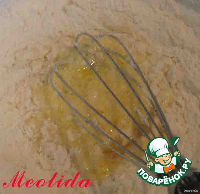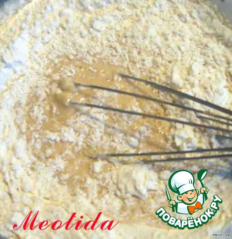 смешиваем яйца (2 шт), сухие сливки (3ст.л. "с горкой"), муку (2ст.л. "с горкой"), немного ванилина (для аромата). все хорошенько взбиваем венчиком, чтобы не было комочков