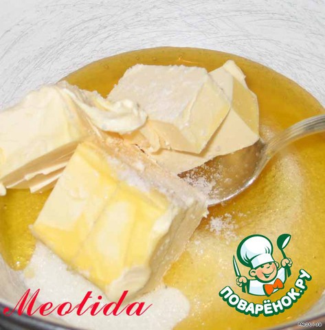 в огнеупорную миску кладем мед, маргарин, сахар и немного ванилина (для аромата), ставим на "водяную баню" и готовим, помешивая, пока маргарин полностью не растворится, затем добавляем соду и яйца(3шт), хорошо перемешивает и готовим еще несколько минут (смесь должна побелеть и увеличиться в 2-3 раза)