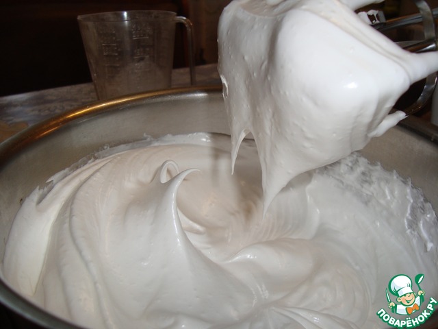 Первый корж смазать кремом, положить на него корж из безе, крем и второй корж. Верх торта и бока обмазать кремом.
