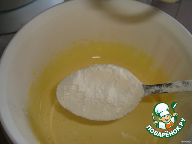 Для коржа: яйца + сахар + мука + разрыхлитель - взбить.