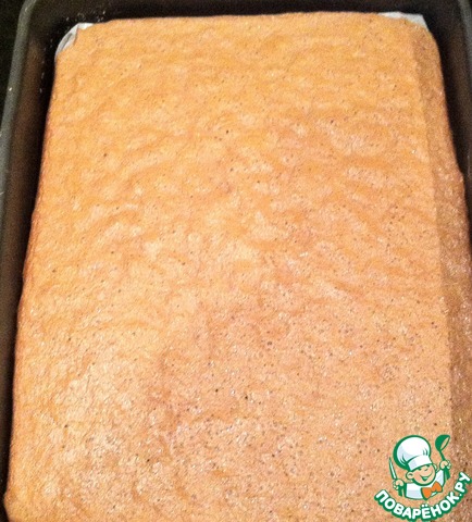 Выливаем тесто в противень размером 30*25 см и выпекаем 15 минут при 180 градусах. Готовый корж должен слегка пружинить при нажатии.