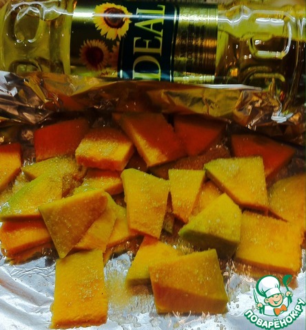 Тыкву нарезаем на тонкие ломтики и запекаем в фольге до мягкости, присыпав 2 ст. л. коричневого сахара и 2 ст. л. подсолнечного масла IDEAL. У меня ушло 20 минут при 180 градусах. Запекала я тыкву одновременно с коржом.