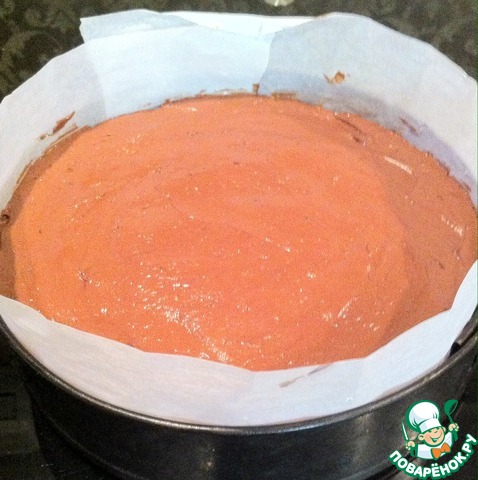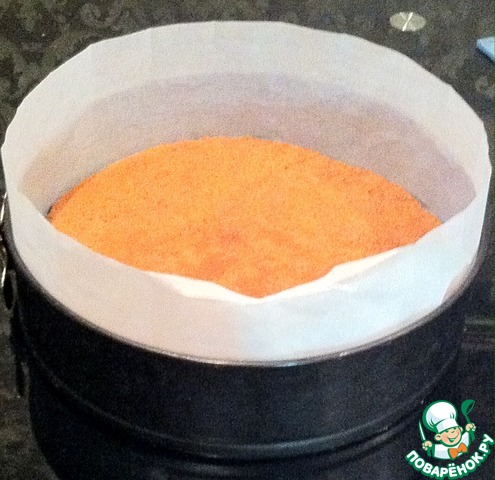 Из остывшего коржа кольцом от разъемной формы диаметром 24 см вырезаем круг и кладём его на дно формы. Пропитываем его сахарным сиропом. Бока формы прикрыть пергаментом.