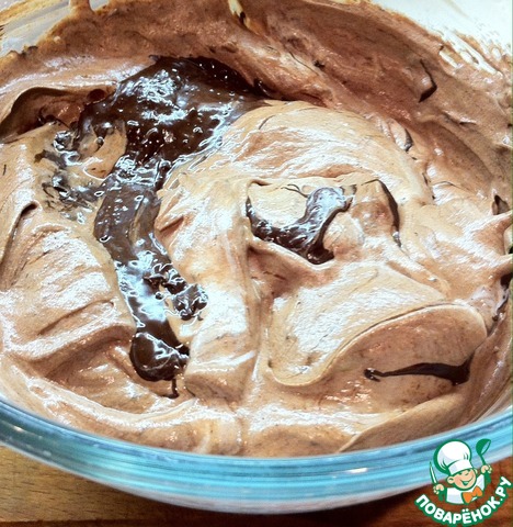 Сливки взбить до состояния пышного крема и в несколько приёмов ввести слегка остывший шоколад.