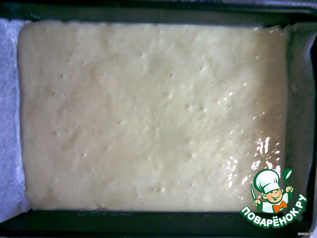 Противень застелила пергаментом, хорошенько смазала его сливочным маслом и вылила тесто.