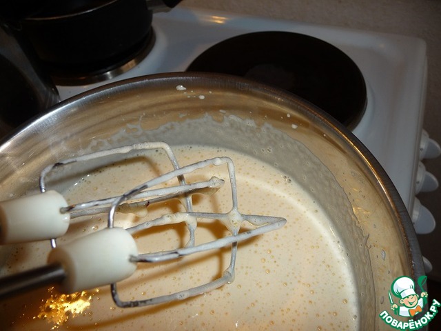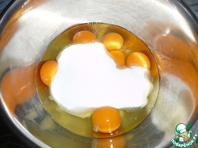 В рецепте написано яйца разбивают в кастрюлю, я взяла миску, добавить сахар.