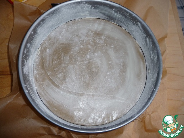 Форму выстелить пекарской бумагой, смазать маслом и слегка обсыпать мукой, излишки муки стряхнуть.