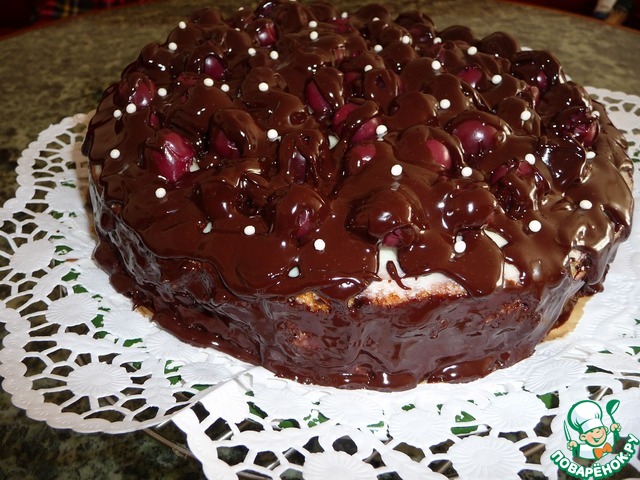 Сверху намазать кремом, сложить второй слой, смазать кремом, третий слой смазать кремом, бока обмазать кремом. Сверху выложить вишню.