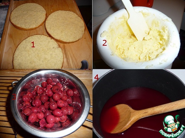 Через 8 часов можно приступить к формированию торта. Бисквит разрезать на 3 части фото 1, взбить масло со сгущенкой в крем, (при взбивании сгущенное молоко вводить частями-постоянно взбивая) фото 2. Вишню поместить в друшлаг, для удаления сока фото 3. В сок от вишни добавить крахмал, поставить на небольшой огонь, при непрерывном помешивании довести до густоты, но не кипятить фото 4 (вишневый сироп), остудить (при желании можно добавить сахар).