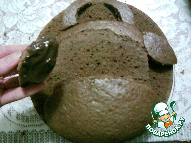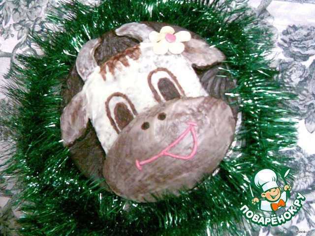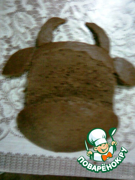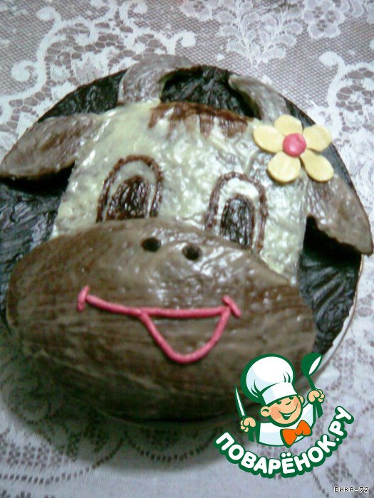 из верхнего (выпуклого) коржа аккуратно вырезаем силуэт мордочки нашего бычка