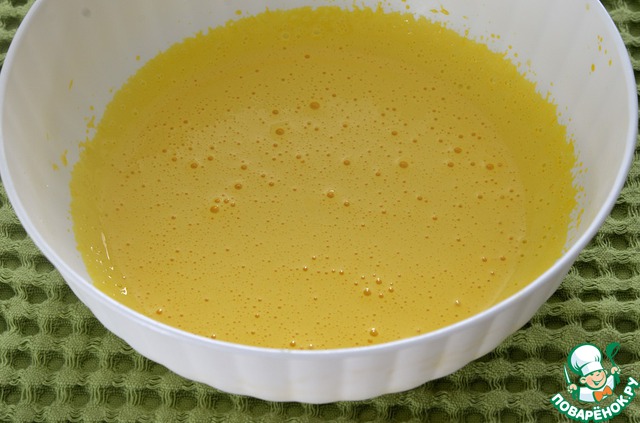 Готовим бисквит: Взбить желтки с половиной нормы сахара до состояния густой воздушной массы.