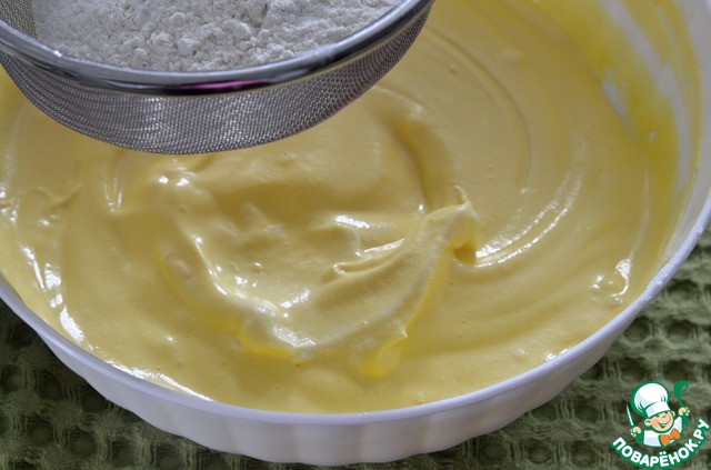 Соединить белковую массу с желтковой, добавить просеянную муку и крахмал, осторожно перемешать. При желании можно ароматизировать ванилином.