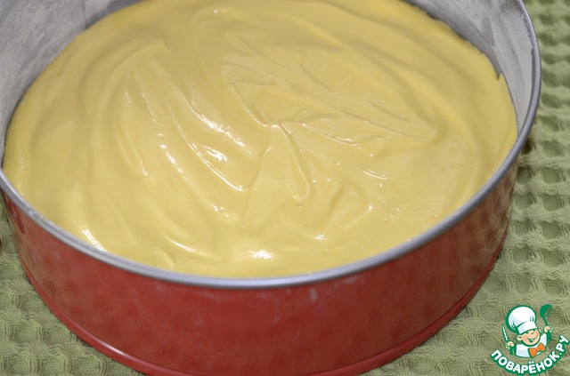Поместить тесто в форму, смазанную сливочным маслом и присыпанную мукой. Я использовала форму диаметром 24 см. Выпекаем в разогретой до 180 С духовке 35-40 минут. Вынуть из духовки готовый бисквит, дать остыть, извлечь из формы.