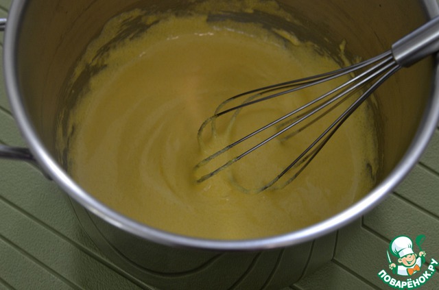 Готовим заварной крем: нагреть на огне молоко. Растереть желтки с сахаром, влить горячее молоко, добавить муку, ванилин. Нагревать смесь до густоты на среднем огне, непрерывно помешивая.