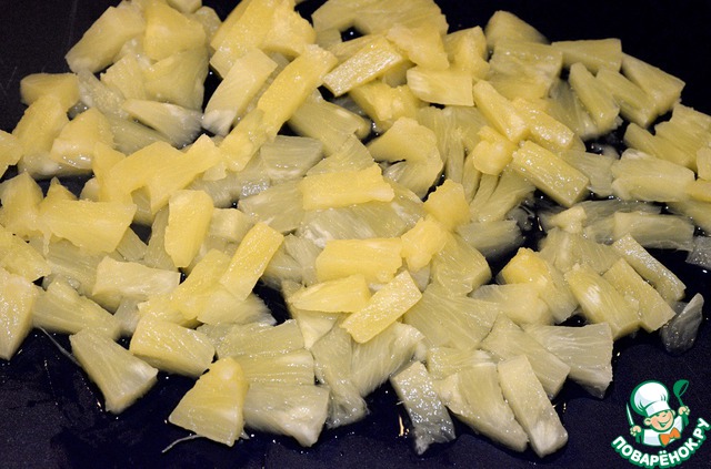 Ананас порезать на мелкие кусочки и дать хорошо стечь сиропу.