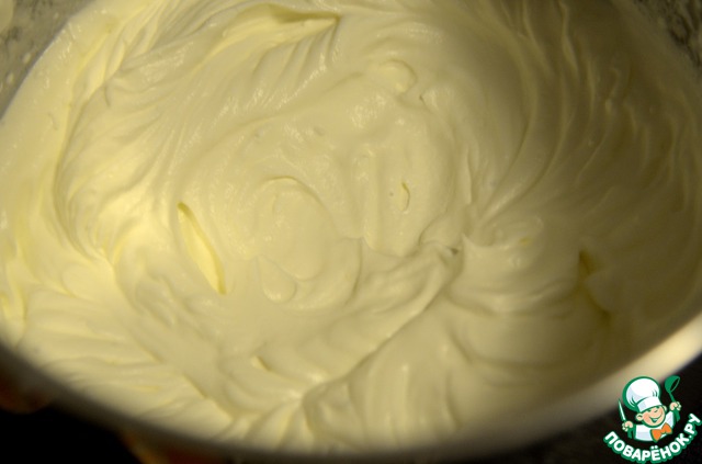 Взбить сливки. Для любителей послаще можно, взбивая, постепенно добавить 100 г сахарной пудры. Смешать взбитые сливки с остывшим заварным кремом, отложив небольшое количество крема от общего объёма, достаточное для покрытия верха и боков торта. Добавить в крем нарезанные ананасы.
