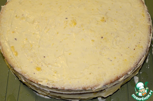 Накрыть торт ранее срезанным верхом, золотистой стороной внутрь, чтобы она касалась начинки. Пропитать сиропом. Покрыть верх и бока торта ранее отложенным кремом с помощью лопатки или ножа.
