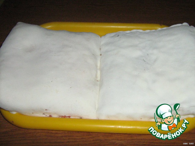 Шоколадный корж я пересушила в духовке, и он ломался, поэтому нет фото. Но я не отчаялась и стала собирать торт: первый собранный корж я залила незастывшей йогуртовой массой,