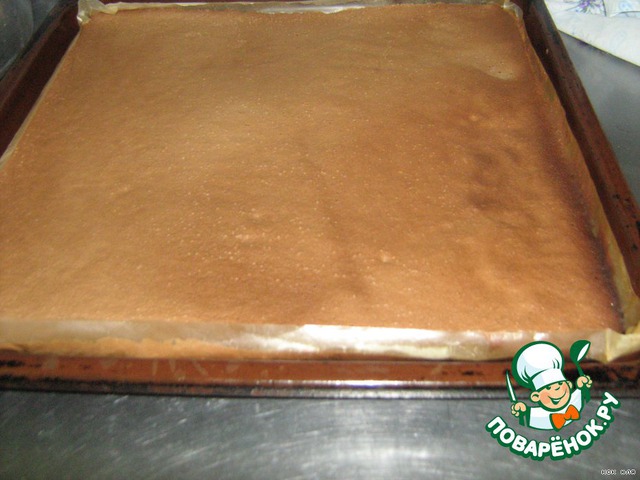 Яйца взбиваем с сахаром до увеличения в объёме в 6-8 раз, кладём разрыхлитель и муку. Выпекаем корж в духовом шкафу при температуре 180-220 градусов на листе, смазанном маслом и застеленном пергаментом .