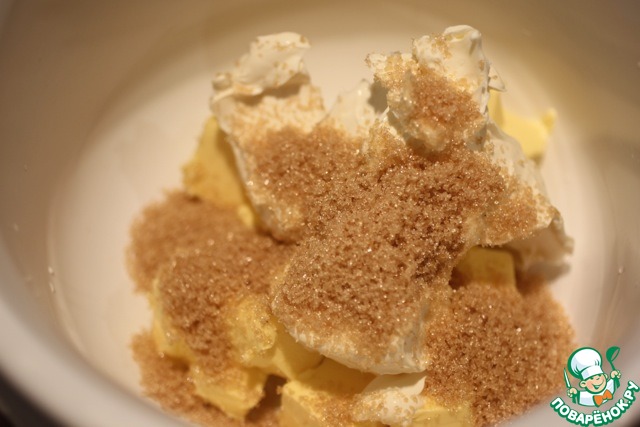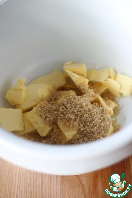 Сливочное масло комнатной температуры смешиваем с коричневым сахаром в чаше миксера и на средней скорости начинаем взбивать.