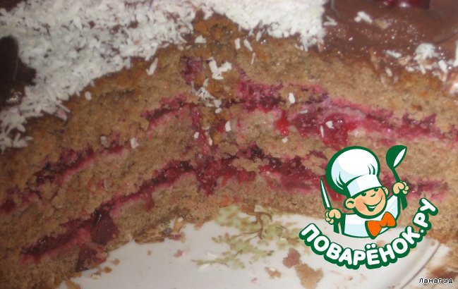 Сверху торт смазать шоколадным кремом(приготовленным по инструкции на пакете),посыпать кокосовой стружкой и украсить целыми вишенками.
