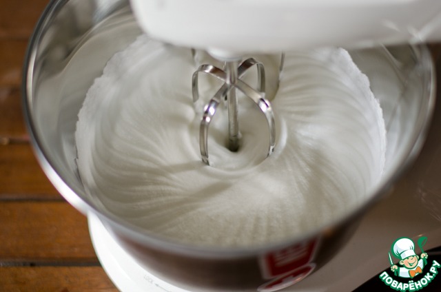 Для бисквита взбить белки с щепоткой соли в крепкую пену, добавить сахар и взбивать еще до получения плотной белой массы.