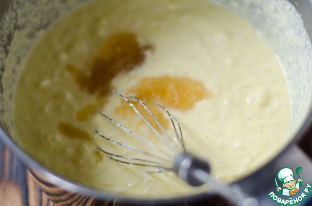 Перелить желтки остальному молоку, добавить ваниль, перемешать и поставить кастрюльку обратно на огонь, варить на медленном огне, постоянно помешивая до состояния жидкого киселя.