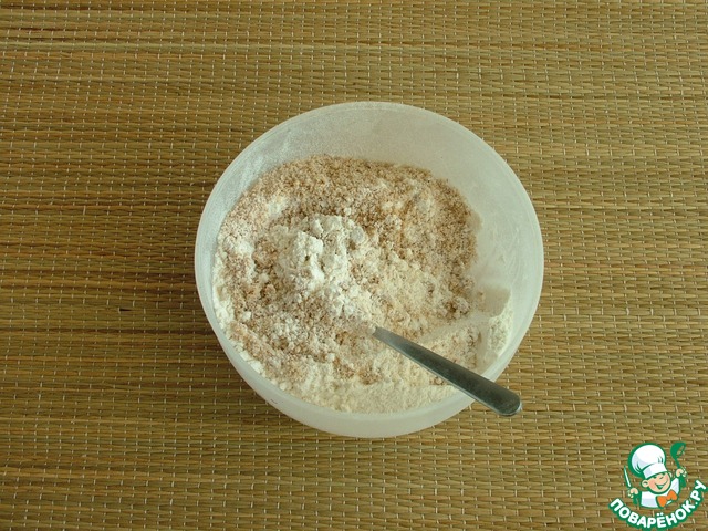 Просеиваем муку вместе с разрыхлителем и корицей, смешиваем с молотым миндалем.