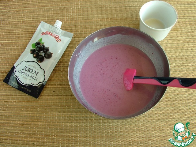 Смешиваем 300 мл йогурта, 250 г джема (50 г оставим для украшения) и распущенный желатин. Ставим в холодильник на 5-10 минут.