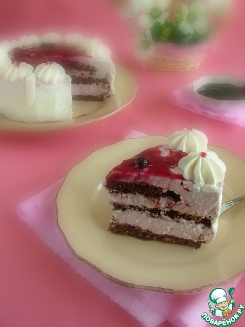 Собираем торт в разъемной форме, чередуя шоколадные коржи и смородиновый мусс. Ставим в морозильную камеру на 1 час. Затем убираем разъемную форму и украшаем торт джемом и взбитыми сливками. Торт лучше всего хранить в морозилке, а перед подачей переложить на час-два в холодильник.