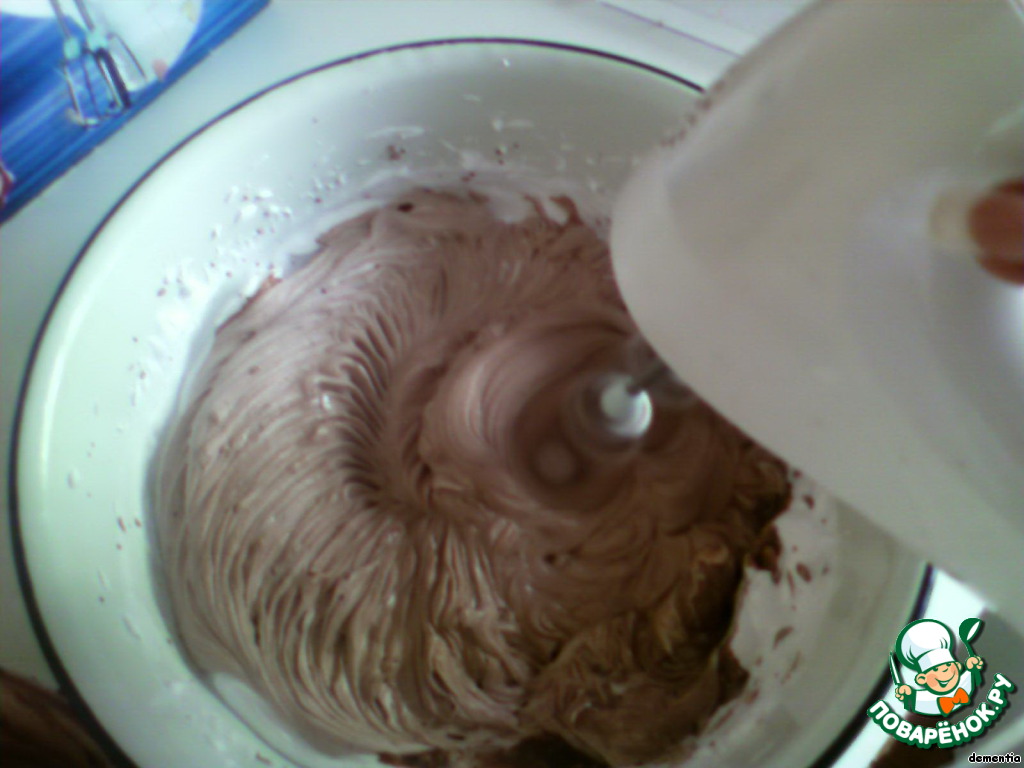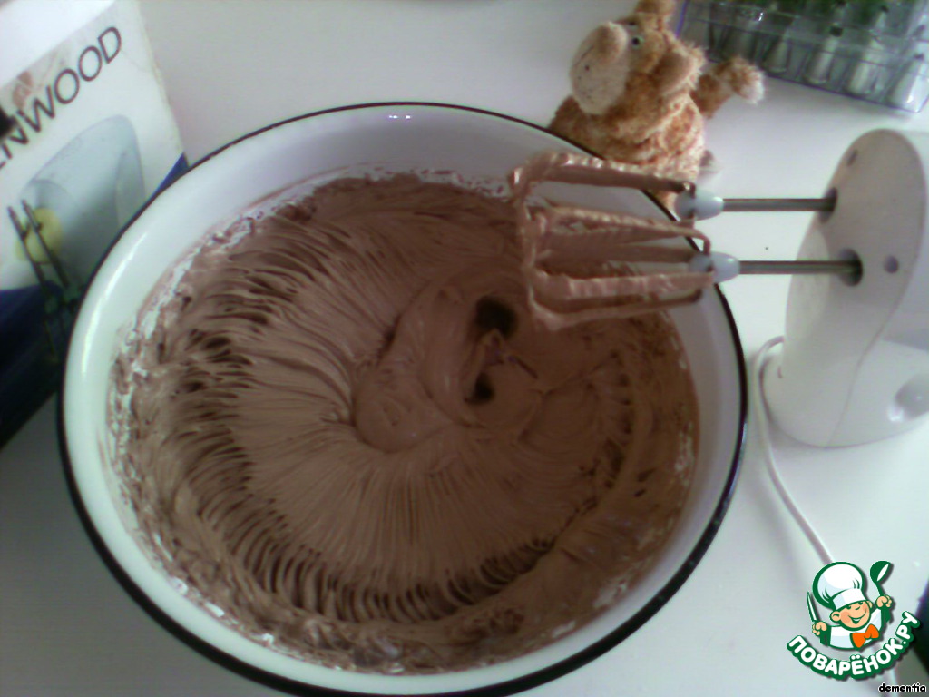 Не спеша вливаем шоколадно-сгущеночную массу во взбитые сливки и взбиваем миксером (минут 5, чтоб масса получилась густоватой). Крем готов. Ставим в холодильник минут на 15.