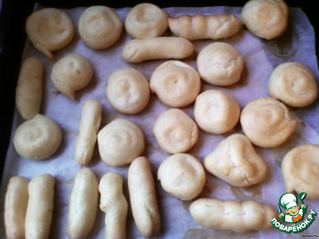 Противень застелаем бумагой для выпечки. Кондитерским мешком (или ложкой) формируем на бумаге шарики или трубочки, оставляя место между фигурками, т.к. тесто вырастет. Ставим в духовку и выпекаем до золотистой корочки, около 40 минут. НЕ ОТКРЫВАЕМ духовку, пока эклерчики пекутся.