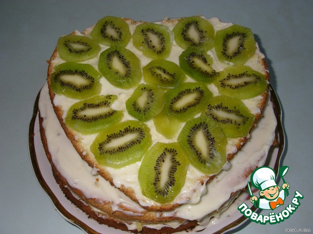 Затем сверху кладем первый корж в виде сердца,смазываем кремом,выкладываем киви и снова кремом.