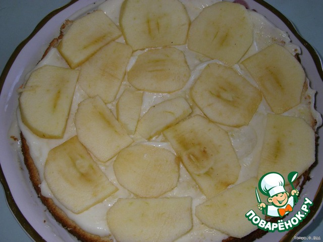 Сделать крем:взбить сметану с сахаром и ван.сахаром,в конце добавить загуститель,перемешать.Разрезаем каждый бисквит на 3 коржа и начинаем фантазировать:Первый используем круглый бисквит:кладемодин корж,затем смазываем кремом и выкладываем яблоки и снова немного смазать кремом.
