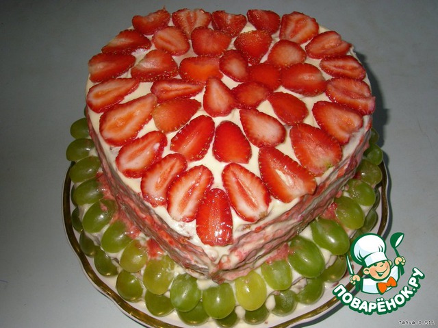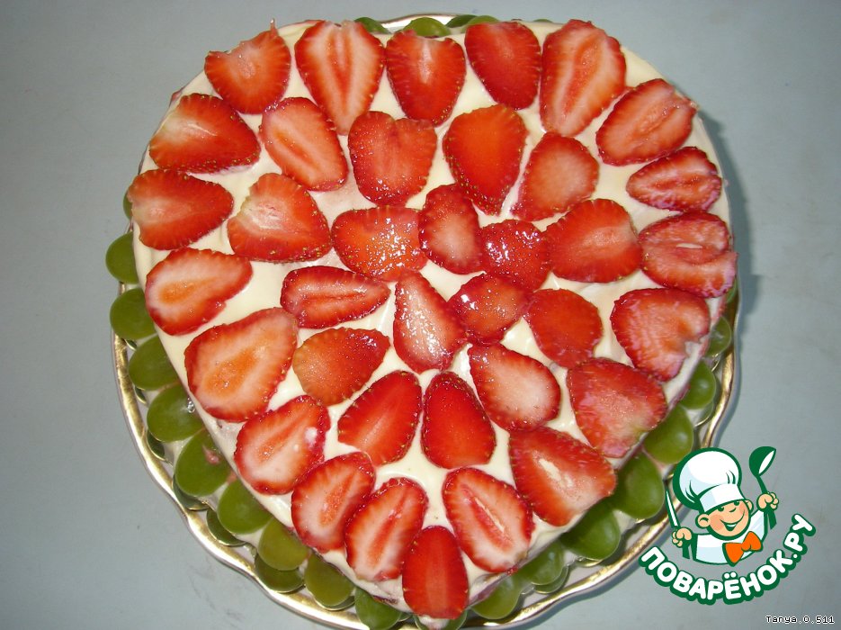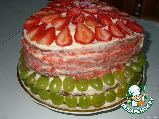Сверху украшаем клубникой,а круглый корж вокруг оформляем виноградом.