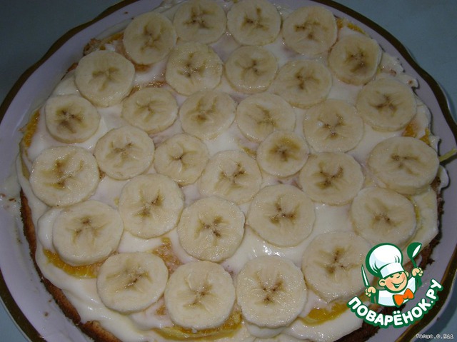 Затем второй корж-крем-апельсины-крем-бананы-крем.