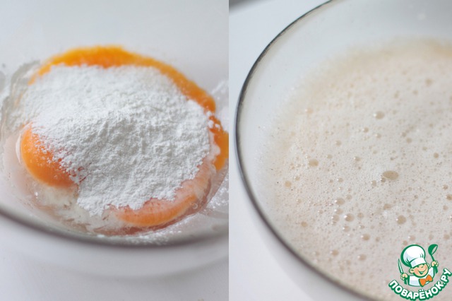 Пока готовится наш пирог, мы займемся приготовлением заварного фисташкового крема. Принцип простой - взбить 2 желтка, крахмал и ванильный сахар. Добавить маленькими порциями горячее молоко и продолжать взбивать.