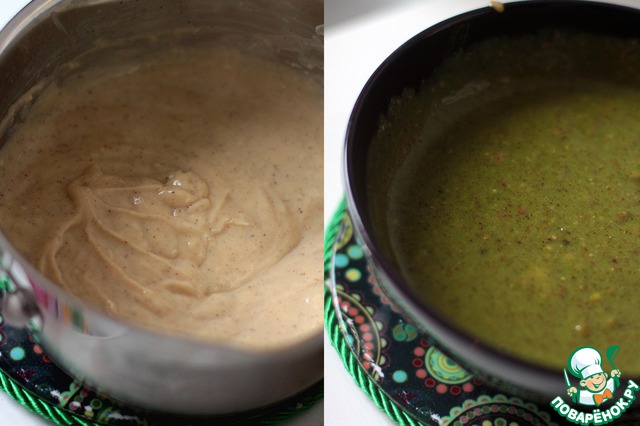 Массу вылить в кастрюльку, поставить на средний огонь и варить до загустения, постоянно помешивая. Ввести 100гр. фисташковой пасты (остальную уберите в морозилку - она отлично хранится несколько месяцев), сливочное масло и зеленый краситель. Я добавила краситель для насыщенности цвета, если вы любите все натуральное, то краситель можно не класть.