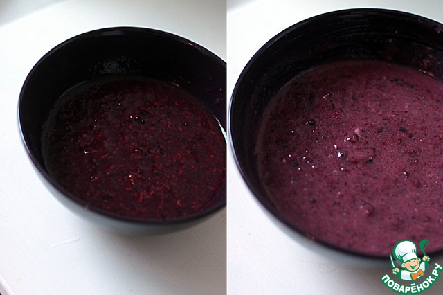 Приготовим второй крем. Замочим желатин в холодной воде, размороженную ежевику измельчим с подошью погружного блендера, соединим с желатином и немного прогреем на плите, буквально 1 минутку. Взобьем сливки до устойчивых пиков с сахаром (50г) и введем в ежевику. Отправим в холодильник остужаться.
